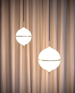 Pendlen Eternal Moonlight er inspireret af månens mystik og tilføjer et raffineret touch til indretningen. Den kugleformede skærm i mundblæst opalglas spreder et blødt lys og er delt af et diskret messingbånd, der symboliserer halvmånen.