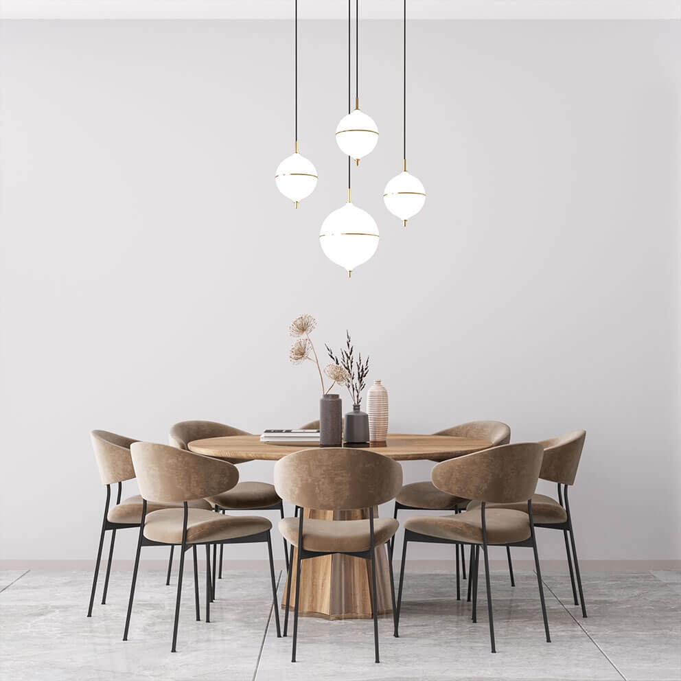 Designet er håndlavet i messing og opalglas og er en tidløs kombination af skandinavisk minimalisme og moderne elegance, hvor den sorte stofledning tilfører en markant kontrast til pendlens lyse udtryk. Et oplagt valg som belysning over spisebordet.