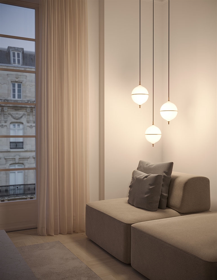 Pendlen Eternal Moonlight er inspireret af månens mystik og tilføjer et raffineret touch til indretningen. Den kugleformede skærm i mundblæst opalglas spreder et blødt lys og er delt af et diskret messingbånd, der symboliserer halvmånen.