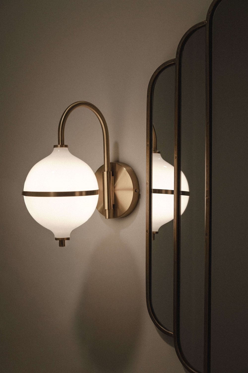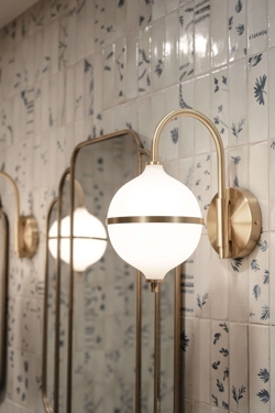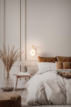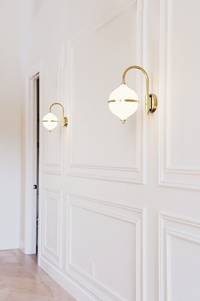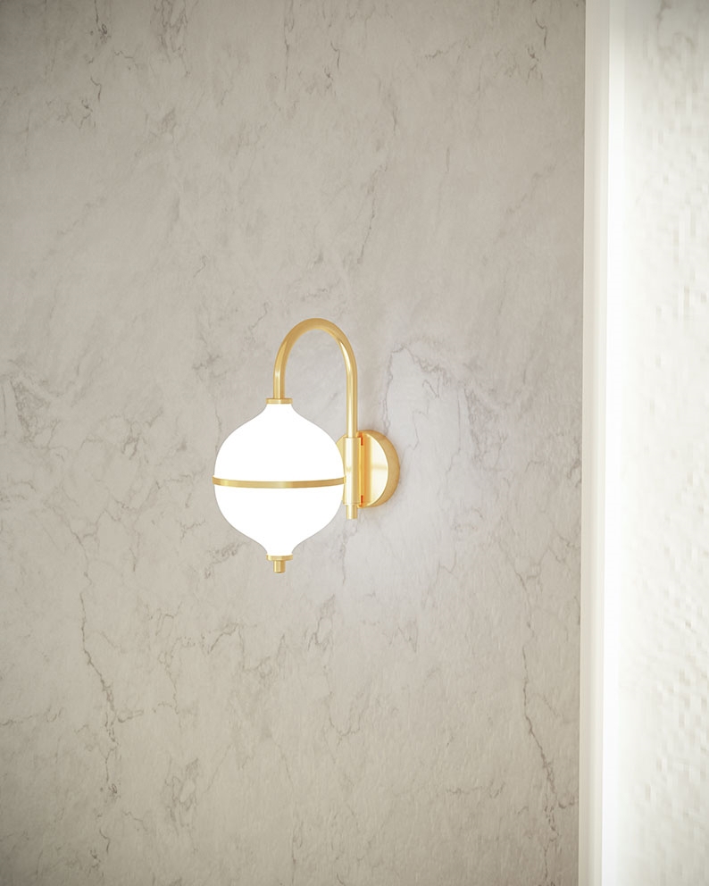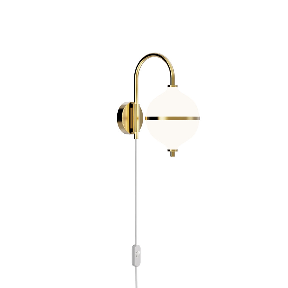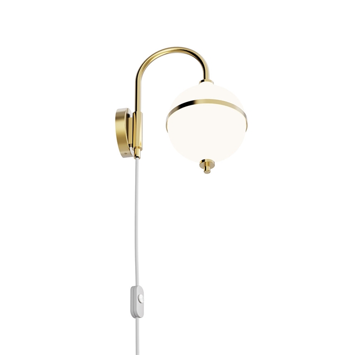 Designet er håndlavet i messing og opalglas og er en tidløs kombination af skandinavisk minimalisme og moderne elegance, hvor den hvide ledning fremhæver lampens lyse og harmoniske udtryk. Et oplagt valg som sengelampe eller belysning til stuen eller entréen. Kan med lampens IP44-klassificering også monteres ved spejlet i badeværelset.