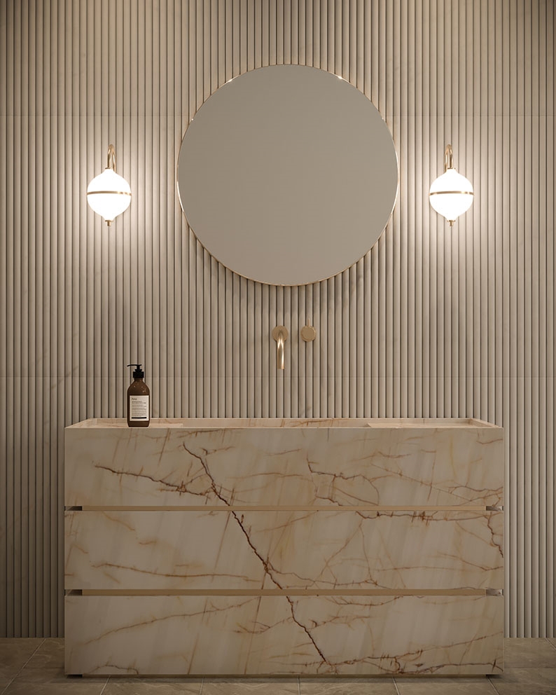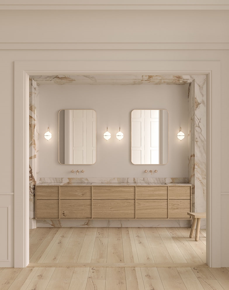 Væglampen Eternal Moonlight er inspireret af månens mystik og tilføjer et raffineret touch til indretningen. Den kugleformede skærm i mundblæst opalglas spreder et blødt lys og er delt af et diskret messingbånd, der symboliserer halvmånen.