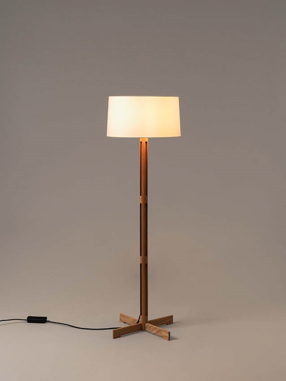 Fad Fija gulvlampen har en solid egetræs struktur, cylinderformet, et tværsnit og en hvid pergament skærm.