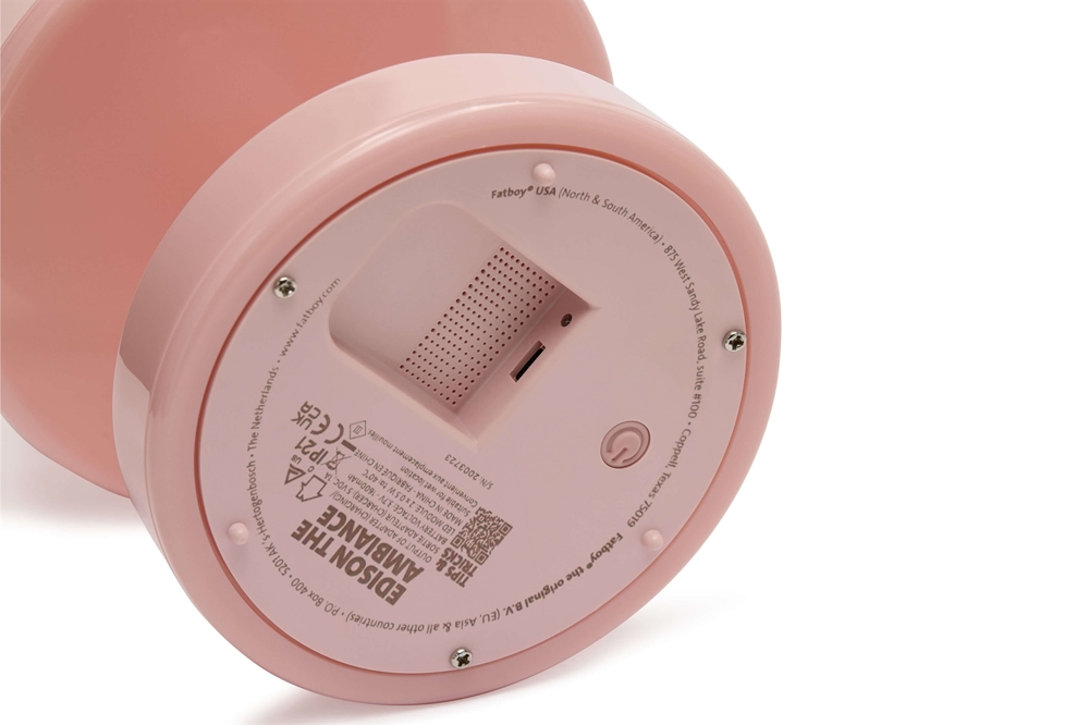 Fatboy Edison the Ambiance er en robust transportabel bordlampe med runde former, en iøjnefaldende pink pastelfarve og