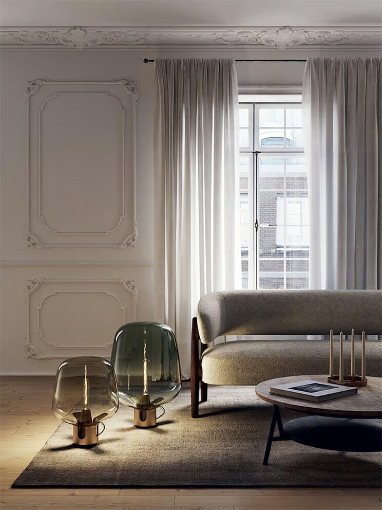 Placer eksempelvis lampen på et sidebord til sofaen eller direkte på gulvet og få stemningsfuld belysning med et markant design. De to størrelser og forskellige finish gør det også oplagt at kombinere lamperne og skabe en unik indretning af både hjem, kontormiljøer og butikslokaler.