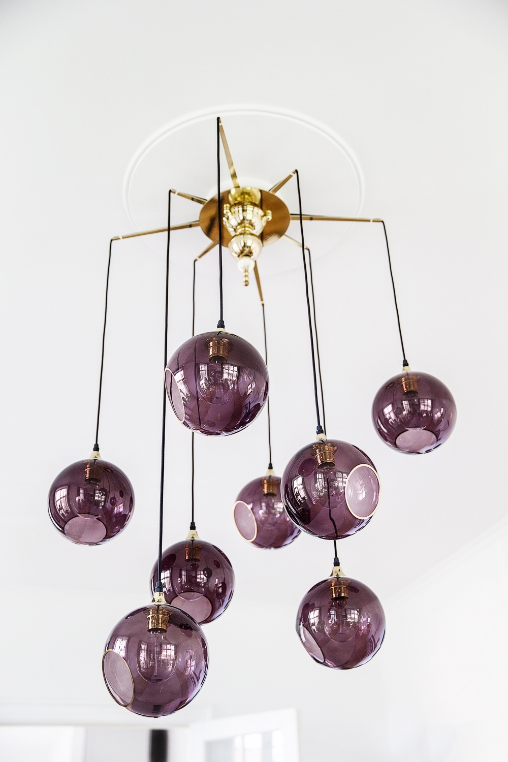 Alle ledninger samles let og fordeles til de mange arme. Ledninger fastgøres derefter af lampens vægt i slids i enden af hver arm.