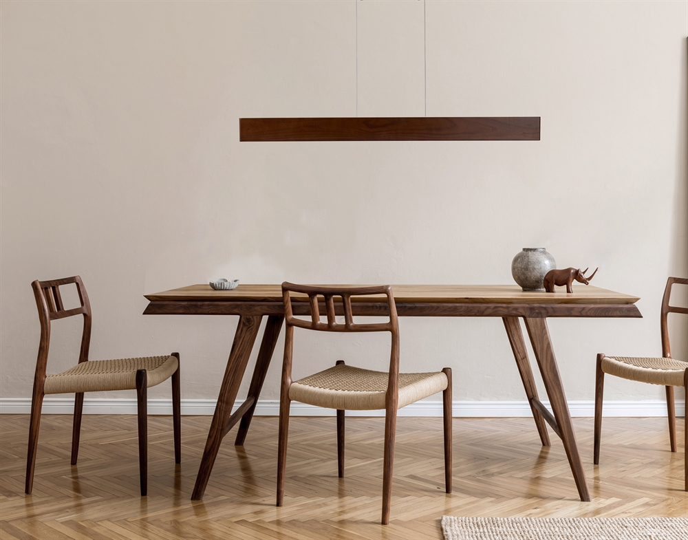 Pendlen fås med to forskellige træfinish – valnød med en varm mørk glød eller sort ask, der giver et mere moderne udtryk.