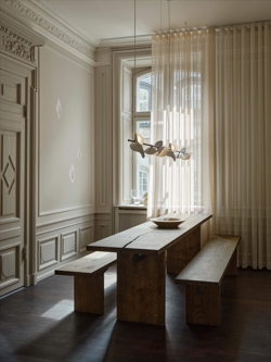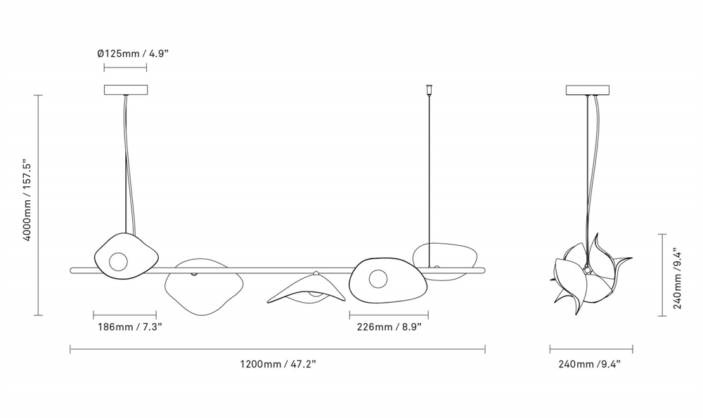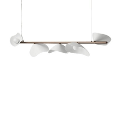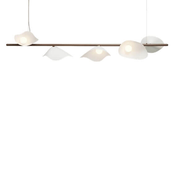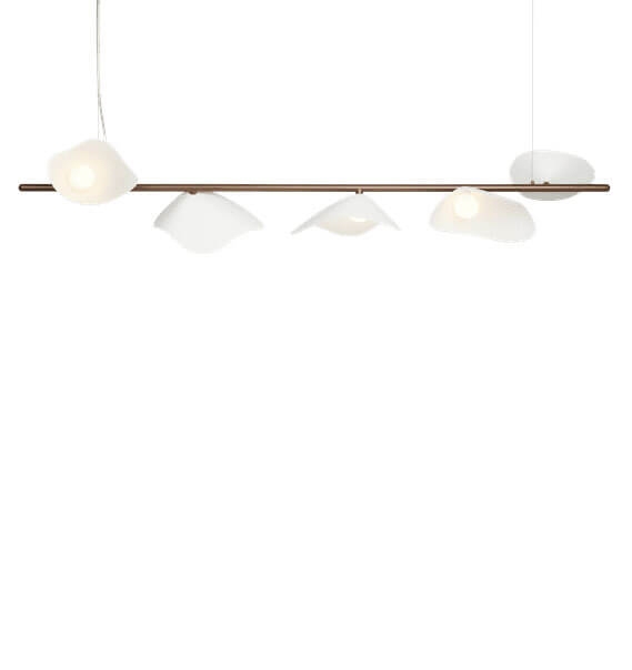 Designet til pendlen Florii 5 er inspireret af en gåtur gennem skoven en lys efterårsdag, hvor sollyset dansede gennem de faldende blade. Resultatet er en enestående pendel med et flot spil mellem lys og skygge fra de fem kronbladsformede skærme, der er monteret på det lineære ophæng. Den elegante aflange pendel med ophæng i metal pulverlakeret i mørk bronzefarve og skærme i opalglas vil passe ind i mange moderne indretninger eksempelvis alene eller to i forlængelse af hinanden over spisebordet.