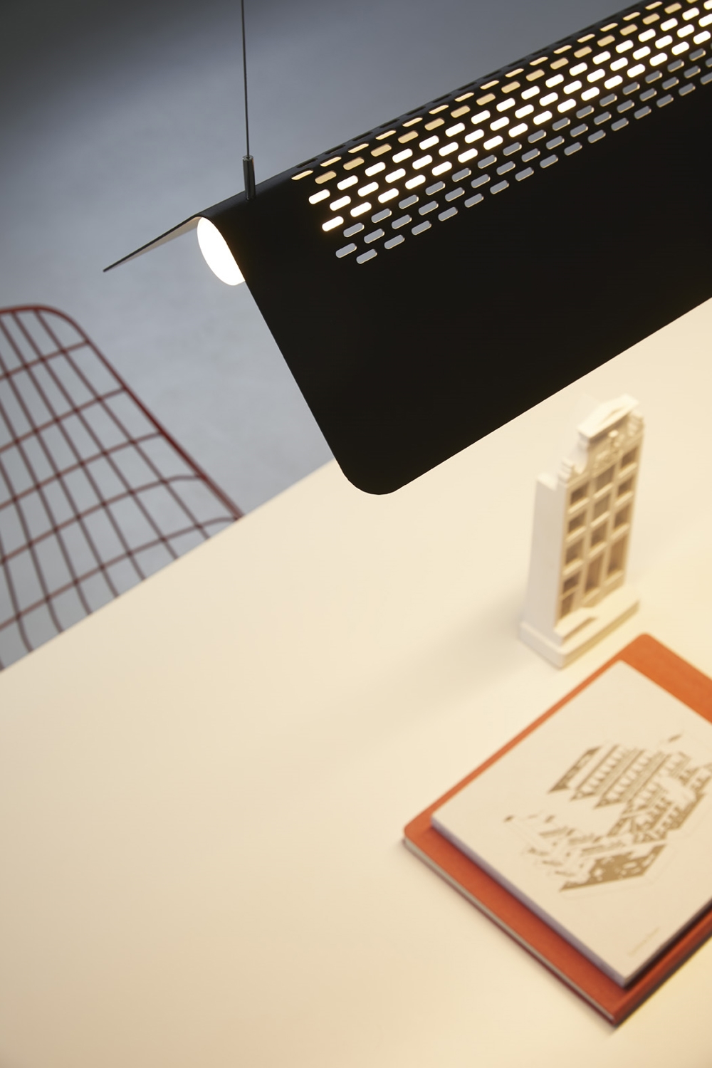 Flybye pendlen består af en pulverlakeret stålskærm med et slankt omrids. Pendlens skærm hviler på det specialfremstillet LED-rør, som giver et hvidt lys. Disse to elementer kombineres for at give funktionalitet og et direkte nedadrettet lys af enestående kvalitet. Dog sikrer skærmens mønster en balanceret lysfordeling i rummet.