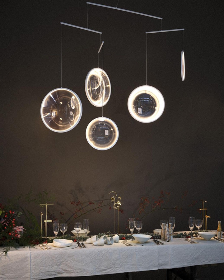 Denne meget elegante pendel er sammensat af 5 lysende skiver lavet af akrylglas. Glasset giver en helt unik effekt og sammen med pendlens geometriske udformning også blikfang til rummet.