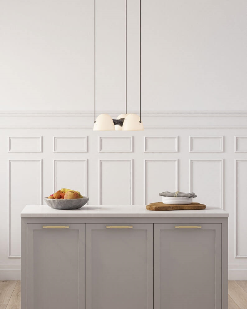Pendlen med de tre skærme er et godt valg som belysning over spisebordet eller som raffineret tilføjelse til entréen eller stuen. Der er også væglamper og genopladelig bordlampe i lampeserien. Skab en helhed i indretningen ved at kombinere lamperne.