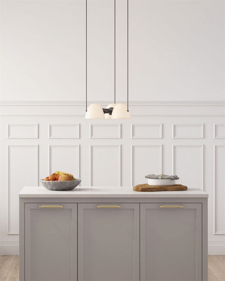 Pendlen Triple Fuse har et klassisk design skabt i holdbare materialer som trelags opalglas, alabast og bruneret messing. De tre medfølgende og udskiftelige lyskilder er placeret bag gennemskinnelige låg af alabast, der sammen med skærmene i trelags opalglas sikrer en blød og blændfri belysning.