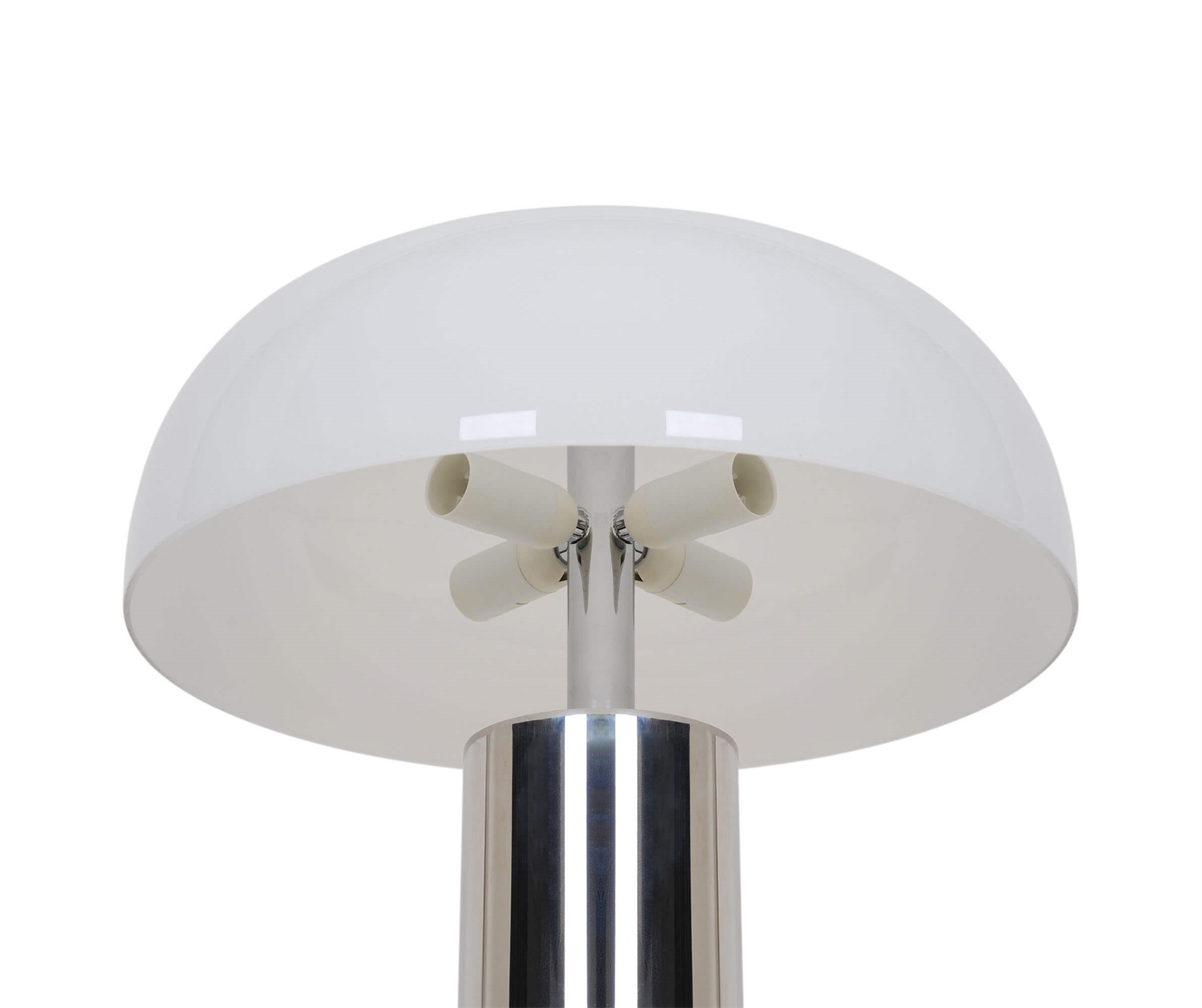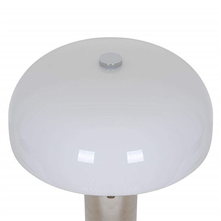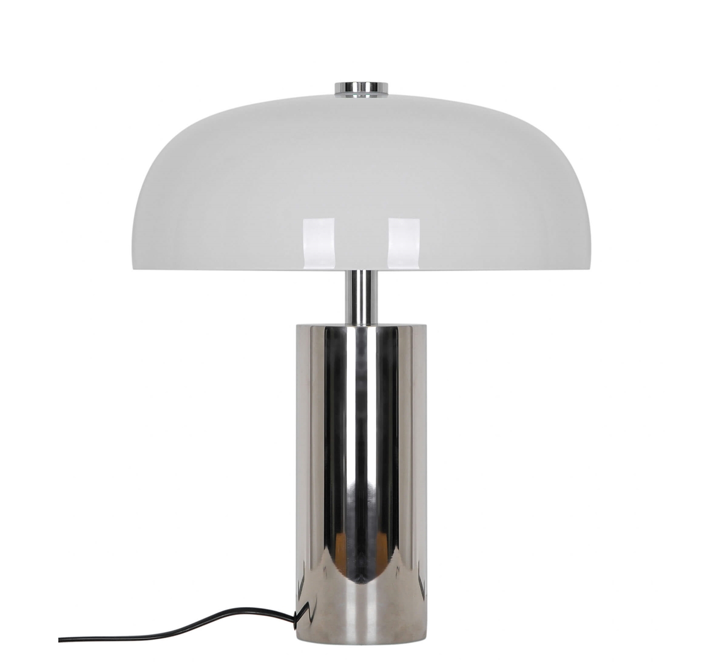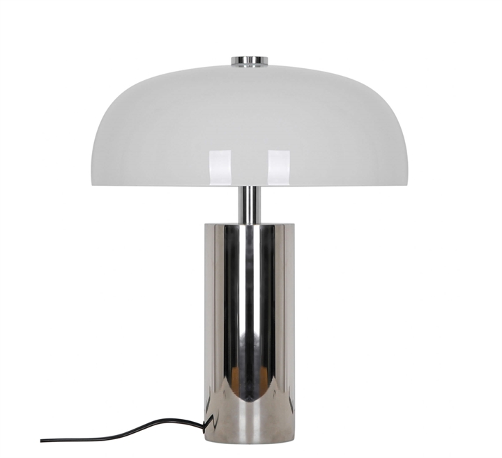 Bordlampen Gabrielle er en dekorativ og stilfuld lampe, der kombinerer klassiske materialer med moderne design. Med sin blanke skærm i hvidt opalglas og base med kromfinish er den et elegant blikfang i rummet, hvor den samtidig spreder et blødt og behageligt lys.