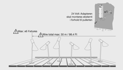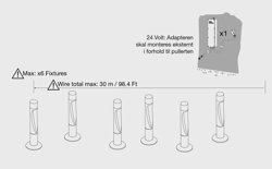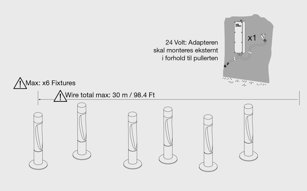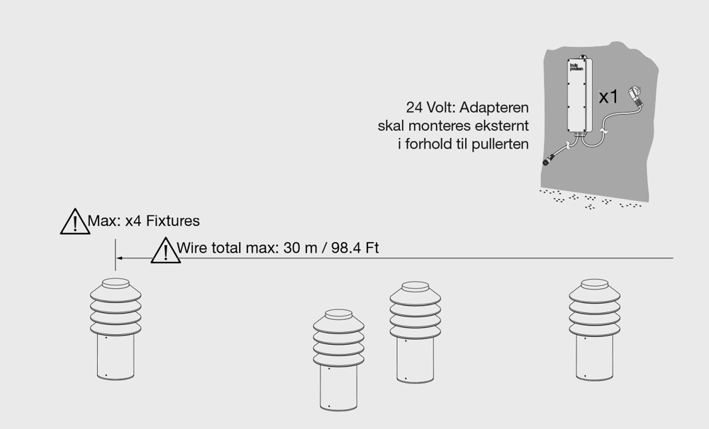 Adapteren (60W) skal monteres eksternt i forhold til pullerten. Der kan tilsluttes op til fire Bysted garden pullerter, op til seks Flindt garden pullerter eller op til seks AJ garden pullerter til adapteren.