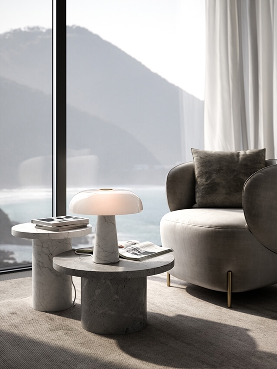 Glossy er en elegant bordlampe med detalje i børstet messing og en smuk marmorbase, som både findes i grå og i hvid. Bordlampen er designet af danske Maria Berntsen, som ønskede at skabe et minimalistisk nordisk design. Samtidig med brug af gode materialer, som gjorde hver lampe unik.