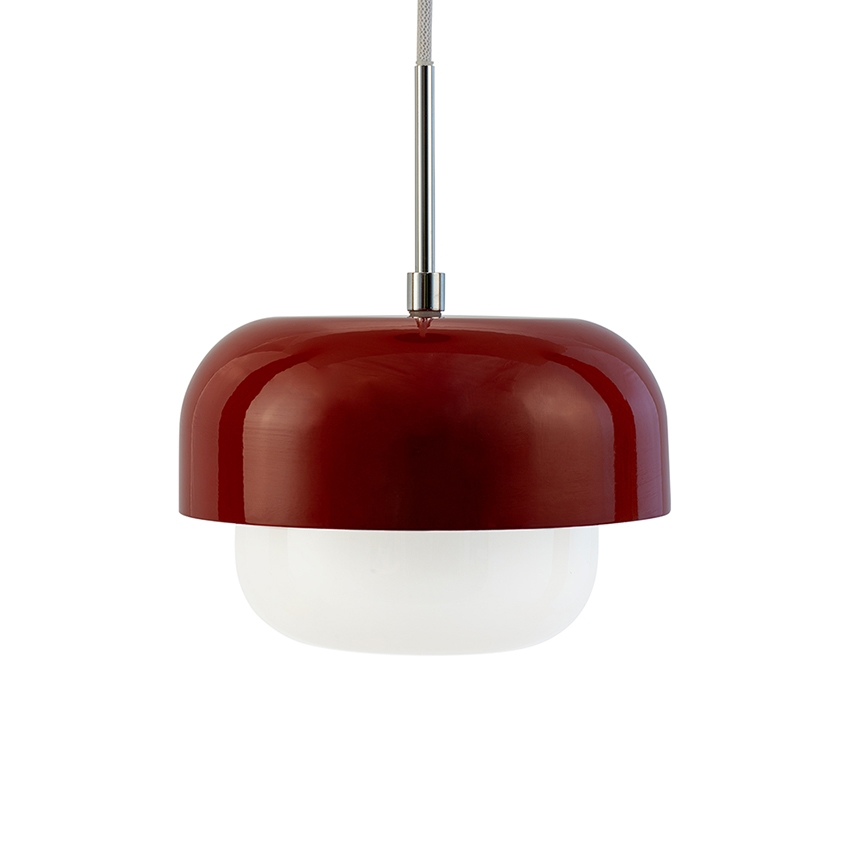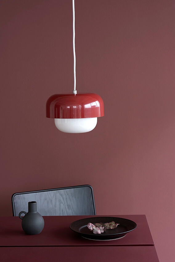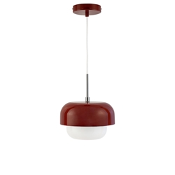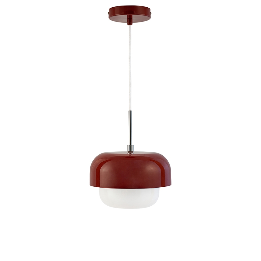 Den smukke røde farve og lampens design er inspireret af Japans farveunivers og Australiens smukke farver. Lampen har en flot metaltop med matchende baldakin, og en skærm lavet af håndblæst opalglas, der giver en smuk lysspredning.