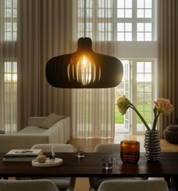 Hazo er en let pendel, hvor de organiske former træder frem med den elegante struktur i FSC-certificeret træ. Et let design i lampen er med til at sende et dekorativt lys ud i rummer, hvor samspillet med lys og skygge opleves. Brug evt en dekorativ pære for at opnå et andet udtryk i lampen.