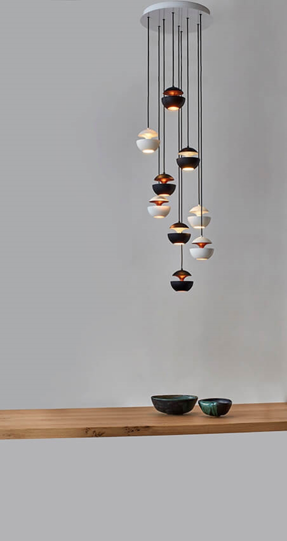 Here Comes The Sun findes i 6 forskellige størrelser i sort/hvid, hvid, sort/kobber eller hvid/kobber. De to største pendler fås dog også i hvid/pink kobber og sort/pink kobber.