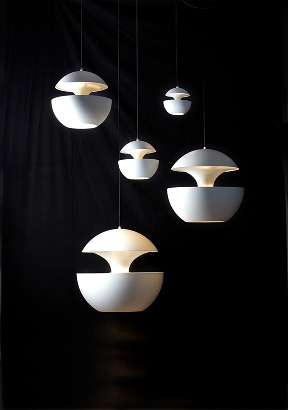 Here Comes The Sun findes i 6 forskellige størrelser i sort/hvid, hvid, sort/kobber eller hvid/kobber. De to største pendler fås dog også i hvid/pink kobber og sort/pink kobber.