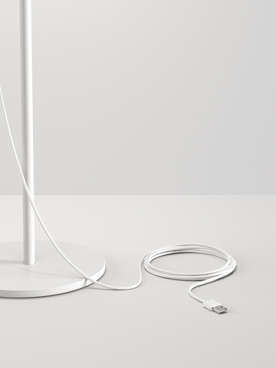 Designeren har omhyggeligt indarbejdet alle de tekniske funktioner, der normalt er udvendigt på lampen - i lampens indre struktur. Derudover kommer strømforsyningen i form af et USB-kabel.