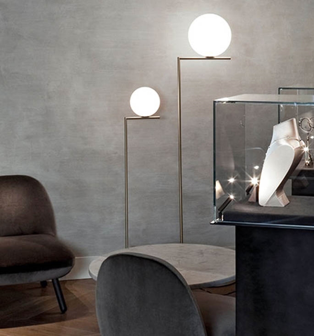 IC Light gulvlampen findes i to størrelser F1 (højde 135 cm) samt F2 (højde 185 cm).