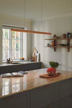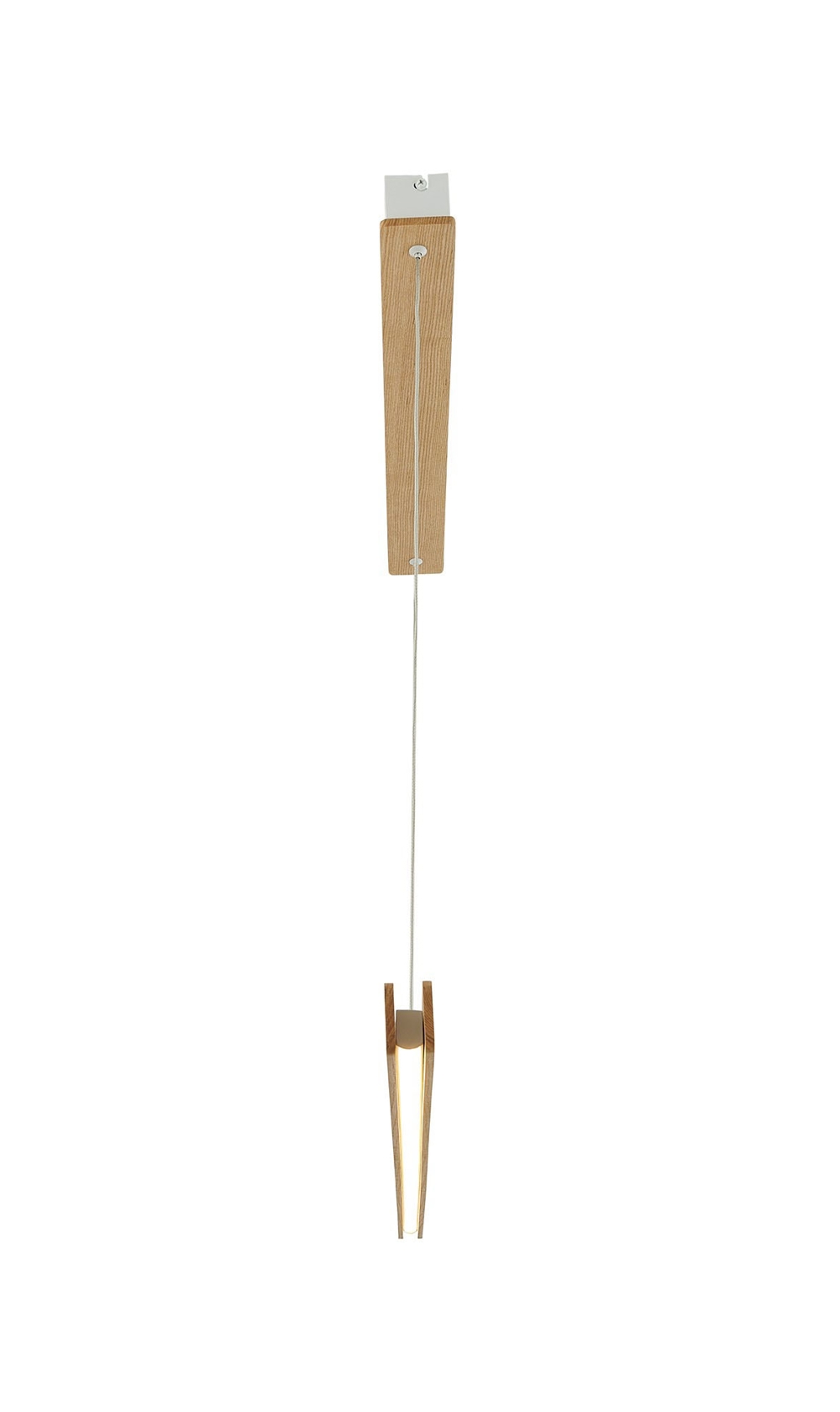 Træets naturlige variation betyder, at hver lampe har sit eget personlige udtryk og vil være et dekorativt element i indretningen. Højdejustering sker let ved at gemme en del af ledningen i baldakinen ved monteringen.