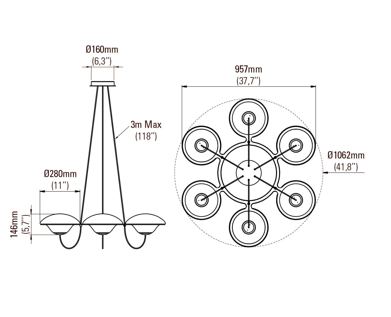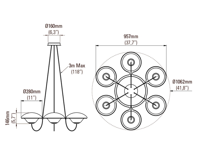 Mål: Ø106,2 cm, skærme: Ø28 x H14,6 cm
