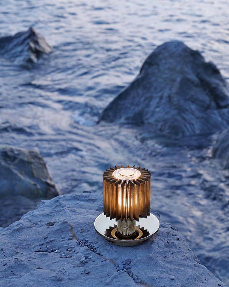 Batterilampen udstråler nuancer af guld og sølv kombineret med bløde skygger fra nettet, der omgiver lyset. Det giver en enestående og magisk stemning til ethvert rum og gør den transportable In The Sun til et oplagt valg til skrivebordet, sofabordet eller natbordet.