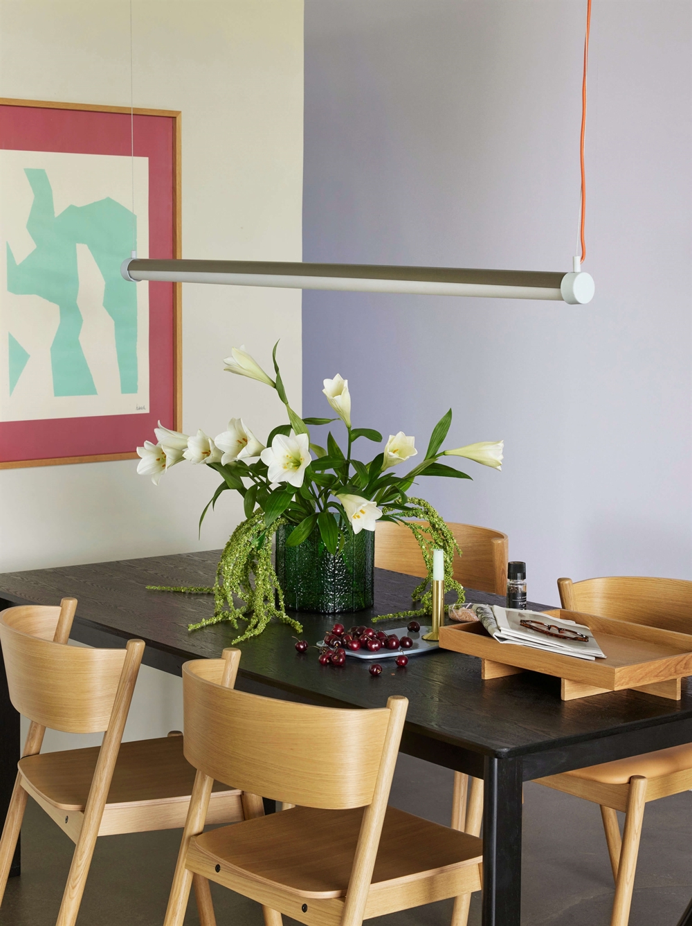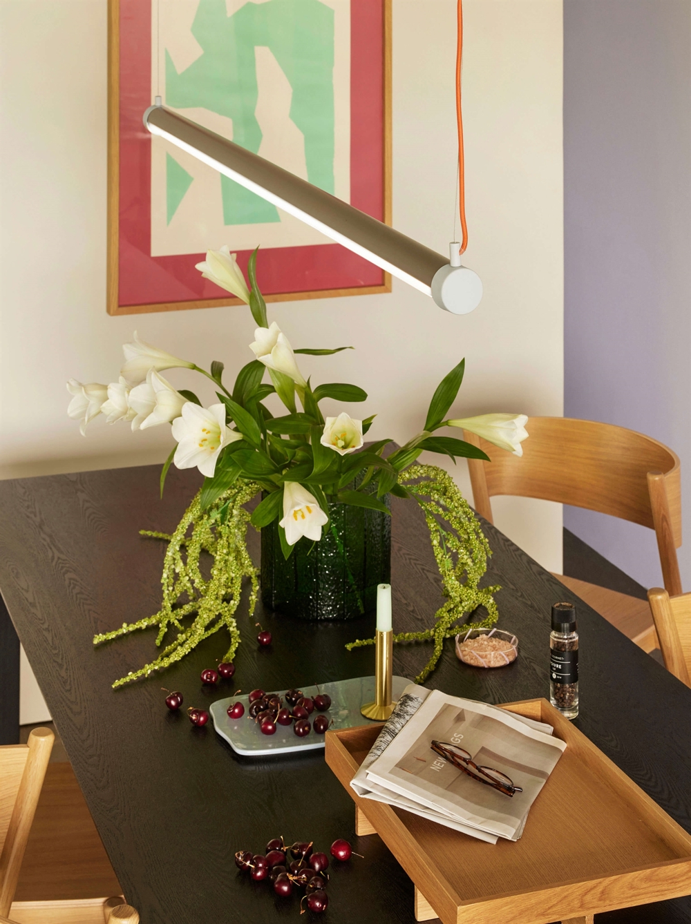 Pendlen Interplay med en længde på 152 cm i aluminium og glas forener retro og moderne med farvekombinationen brun, blå og orange. Benyt eksempelvis pendel som stilfuld belysning over spisebordet, praktisk arbejdslys eller en iøjnefaldende tilføjelse til ethvert rum med behov for godt lys med et raffineret udtryk.