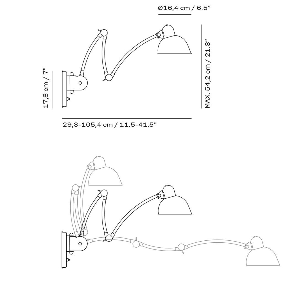 Mål: Skærm: Ø16,4 Base: H17,8 cm Lampearm: 29,3-105,4 cm
