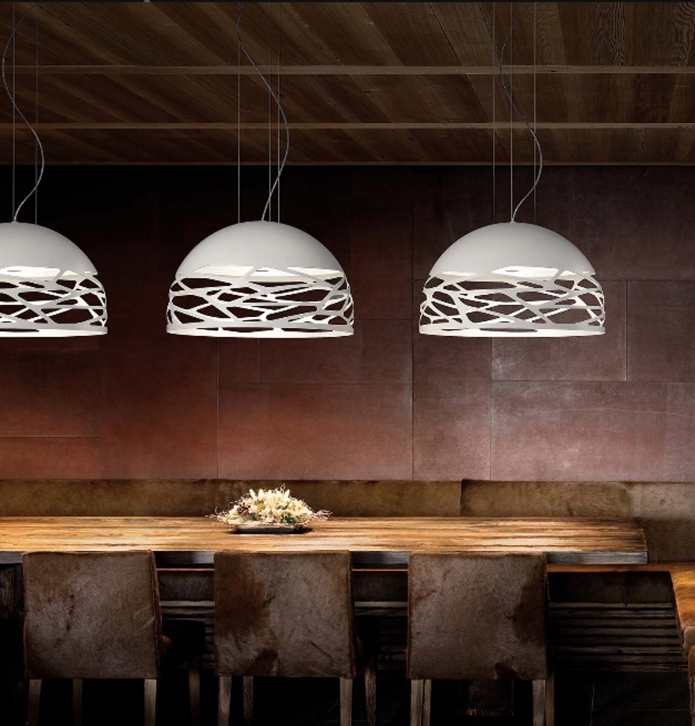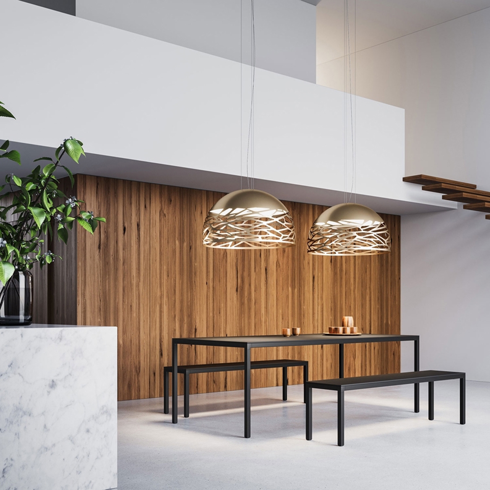 Kelly Dome pendlens laserskåret skærm giver lyset mulighed for at strømme ud, og give et flot spil i rummet. Pendlen giver et behageligt lys, og kan derfor med fordel placeres over spisebordet eller i stuen.
