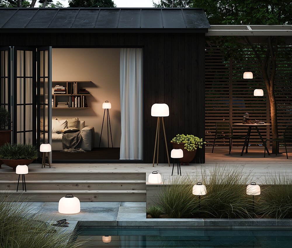 Kettle er en flot batterilampe, hvor funktionalitet er prioriteret højt. Der medfølger udskifteligt tilbehør, så det dermed er muligt, at få den type lampe, der passer til ens behov. Med lampen fås en snor, der gør det muligt, at hænge batterilampen rundt i haven for at skabe en hyggelig belysning. Der findes også spyd eller trefod, så lampen kan fungere som bordlampe eller gulvlampe. Med lampens runde og bløde former giver den et roligt udtryk, hvor den diffuse skærm giver et blidt lys.