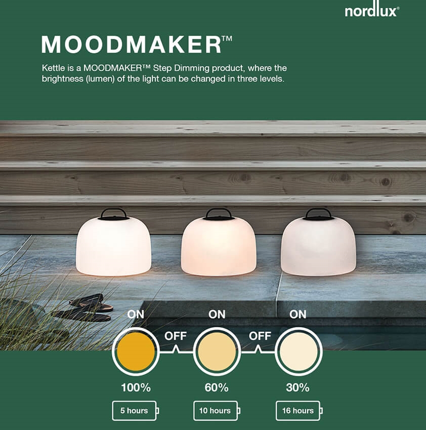 Kettle serien består af batterilamper produceret i hård plast, hvilket gør lampen modstandsdygtig overfor hårdt vejr, ligeledes har den en ip-klassificering på 65, hvilket gør den vandafvisende.