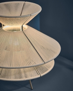 Bordlampen Kiku er inspireret af traditionelle japanske samuraihatte og har med de enkle linjer samtidig en klar reference til skandinavisk design. Lampens kombination af rustfrit stål og hørtråde skaber en lethed i designet, hvor trådende i skærmen bidrager til at skabe et blødt og funktionelt lys og en flot grafisk lyseffekt på omgivelserne. Dæmpbar afbryder på ledningen.