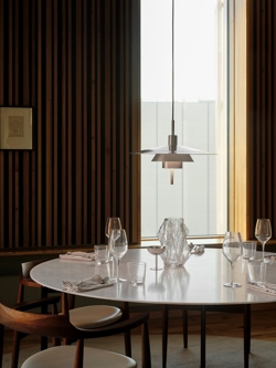 Pendlen har et blødt og blændfrit lys og er velegnet som belysning over spisebordet og køkkenøen eller i stuen. Det minimalistiske design danner en elegant geometrisk silhuet, mens metalskærmenes børstede kromfinish giver et køligt og tidløst udtryk. Med en aftagelige stang nederst på pendlen er det muligt selv at tilpasse lampens udseende.