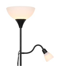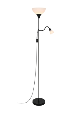Gulvlampen Lauria har en stor skærm med uplight på toppen og et praktisk mindre og fleksibel læselys på siden af standeren. Separate knapper på afbryderen gør det mulig at tænde lyskilderne en ad gangen eller begge samtidig.