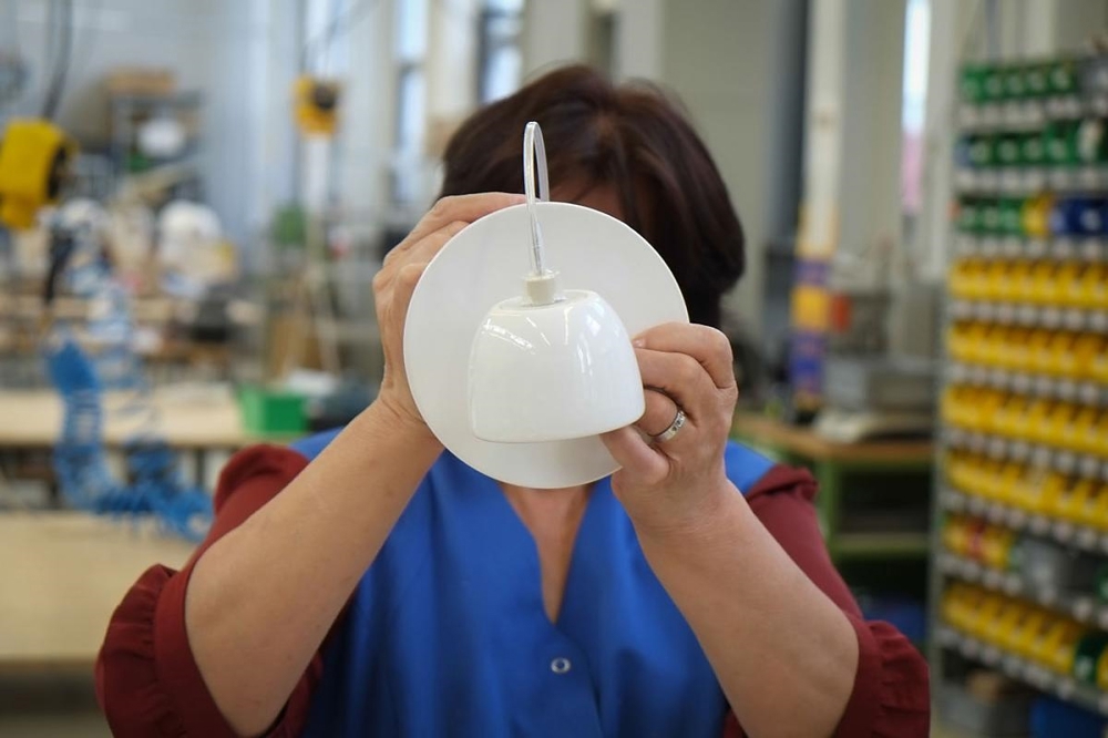 Ingo Maurer Light Au Lait væglampen er fremstillet i sten ware, silikone og rustfrit stål. Koppen svinger gennem 180° og kan bøjes down-up til 30° ved hjælp af et kugleled. Integreret trækkontakt med ske.