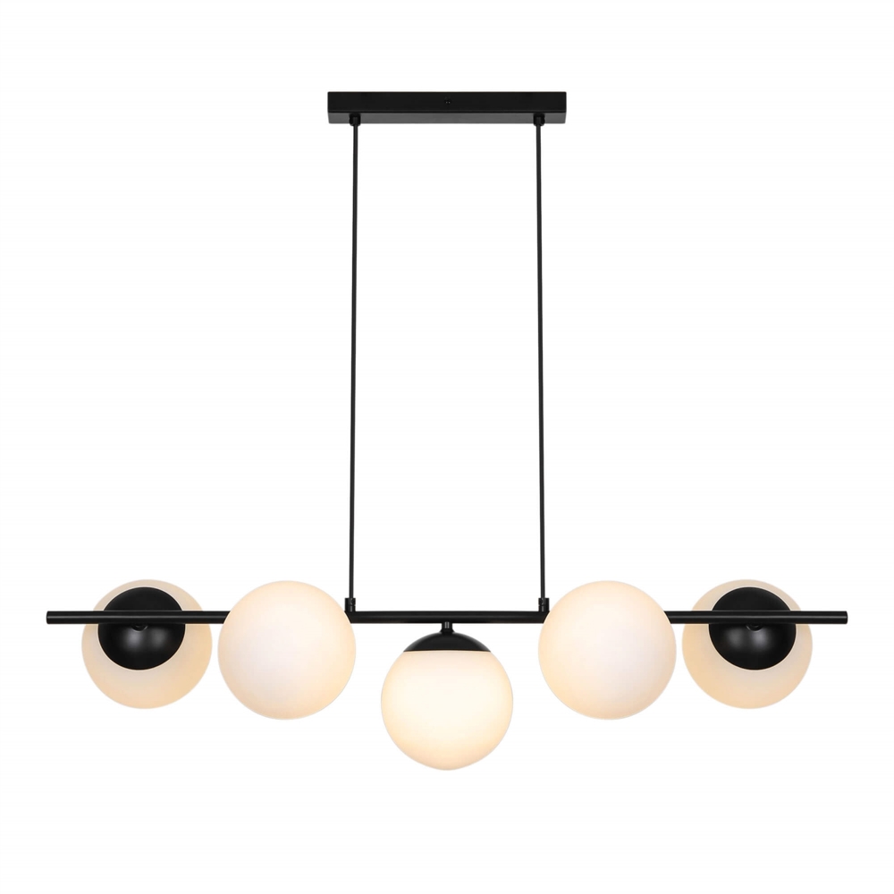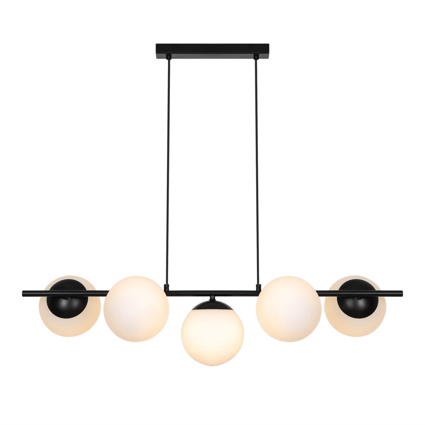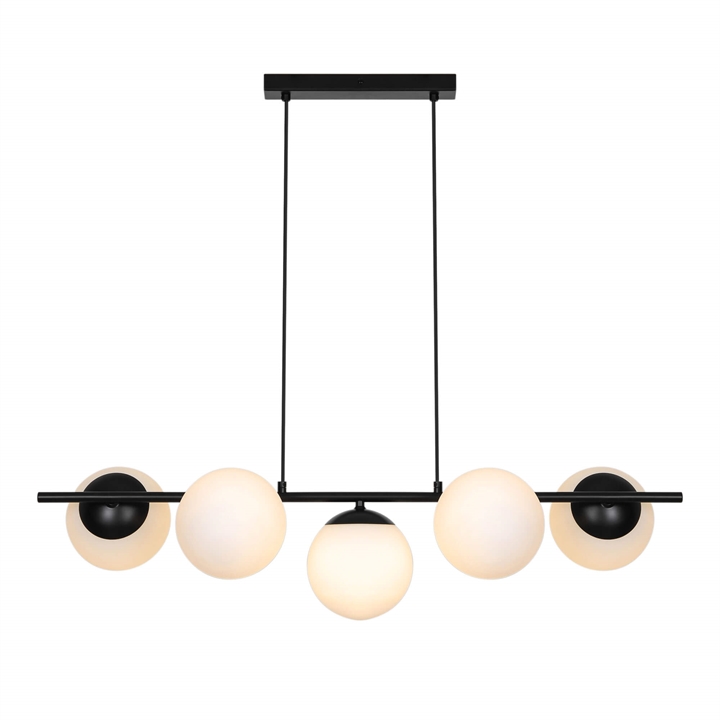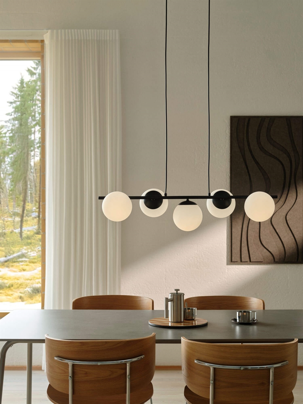 Pendlen Lilly 5-spot med fem mundblæste kugleskærme i hvidt opalglas spreder et blødt og behageligt lys og skaber en varm atmosfære over spisebordet eller i stuen, entréen eller soveværelset. Designet kombinerer moderne minimalisme med raffineret elegance og har en metalstruktur med sort finish, der skaber en smuk kontrast til de lysende opalhvide glaskugler.