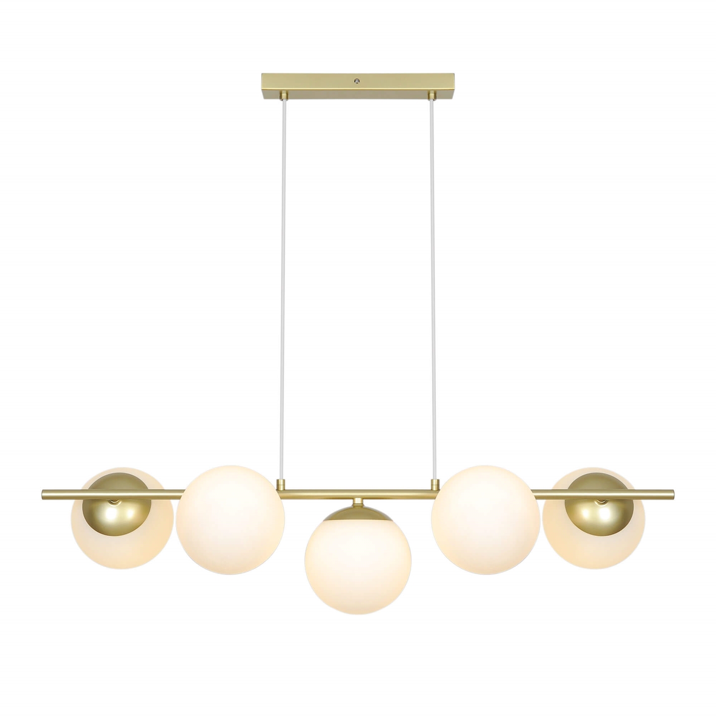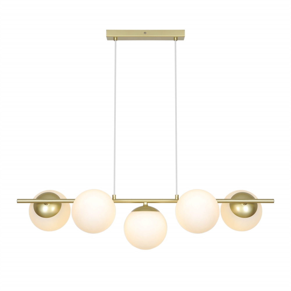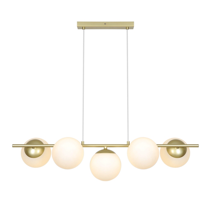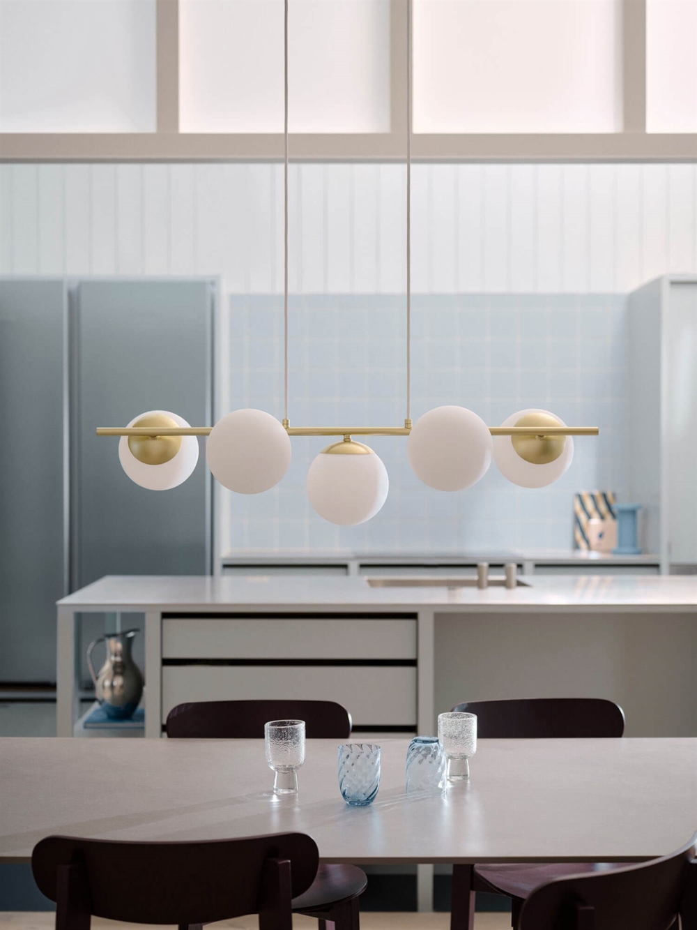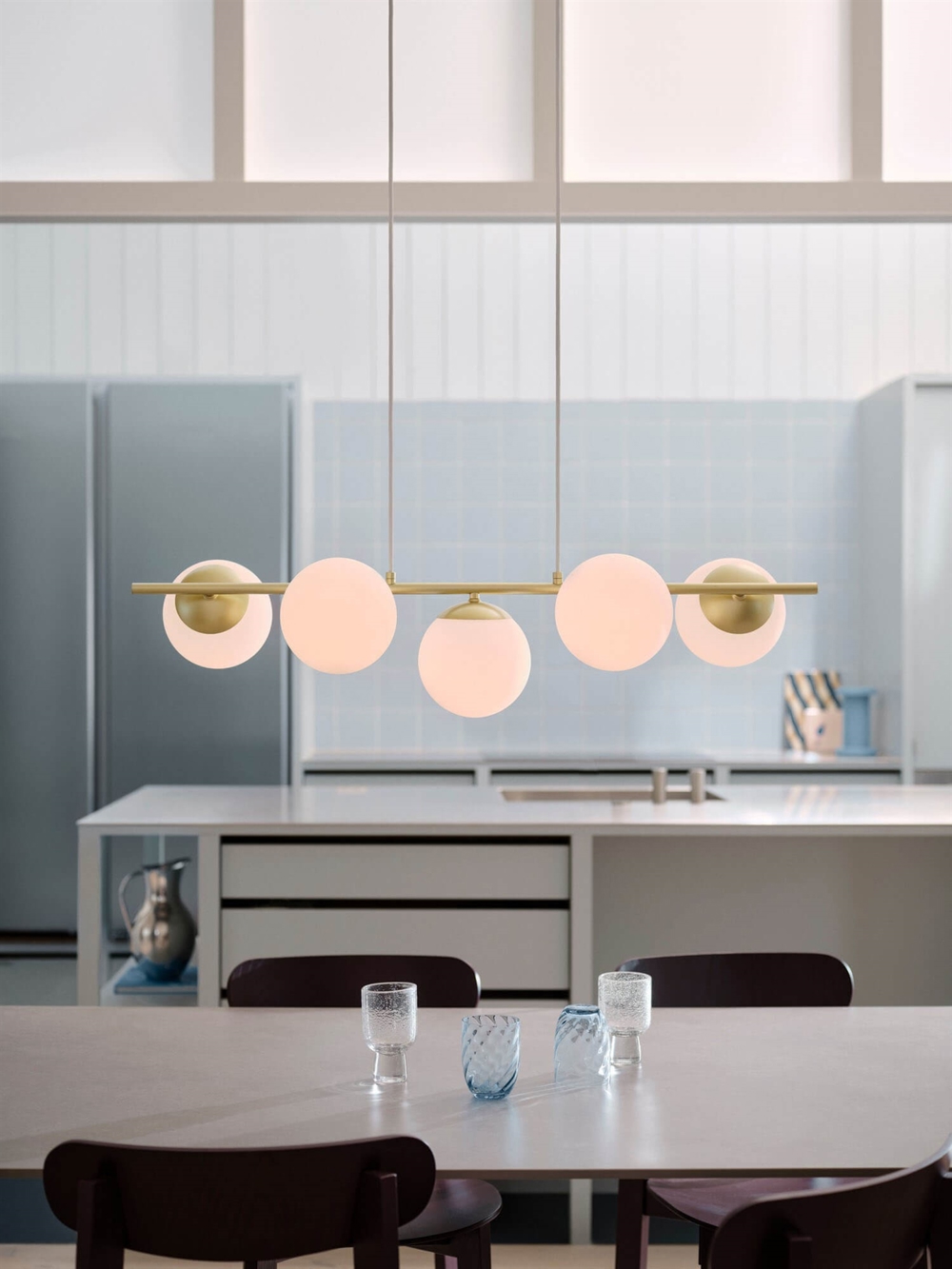 Pendlen Lilly 5-spot med fem mundblæste kugleskærme i hvidt opalglas spreder et blødt og behageligt lys og skaber en varm atmosfære over spisebordet eller i stuen, entréen eller soveværelset. Designet kombinerer moderne minimalisme med raffineret elegance og har en metalstruktur med finish i messing, der spiller smukt sammen med de lysende opalhvide glaskugler.