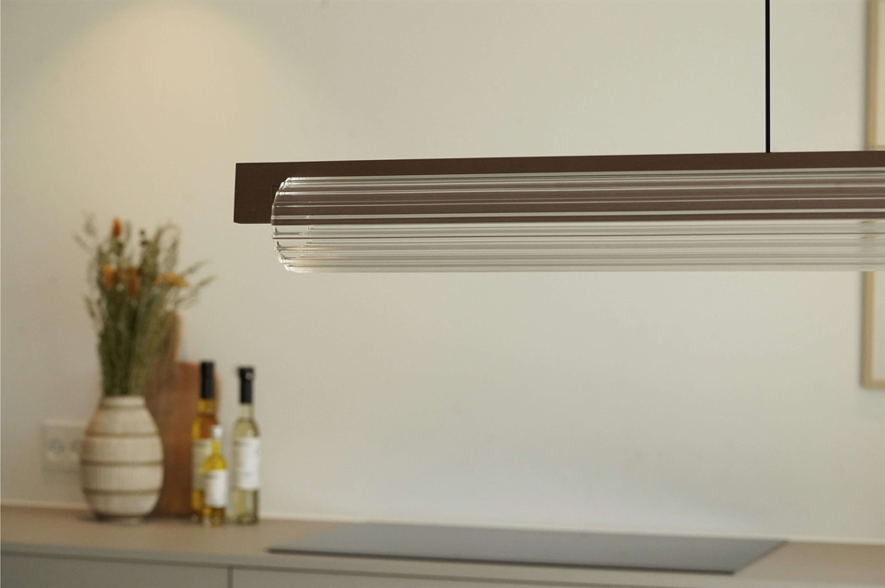 Lirra giver et indirekte varmt lys fra den integrerede LED-lyskilde, der kan dæmpes via en vægkontakt. Skærmen med klart, vandret rillet glas reflekterer lyset smukt, mens base med tidløs finish i dark coffee eller messing giver pendlen et eksklusivt udtryk.