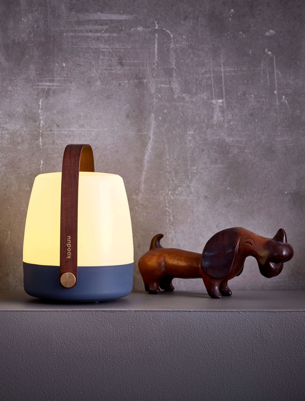 Kooduu lampen skaber blikfang i enhver indretning. Lite-up har krop af hvid PE med soft-touch. Håndtaget er af mørkt træ.