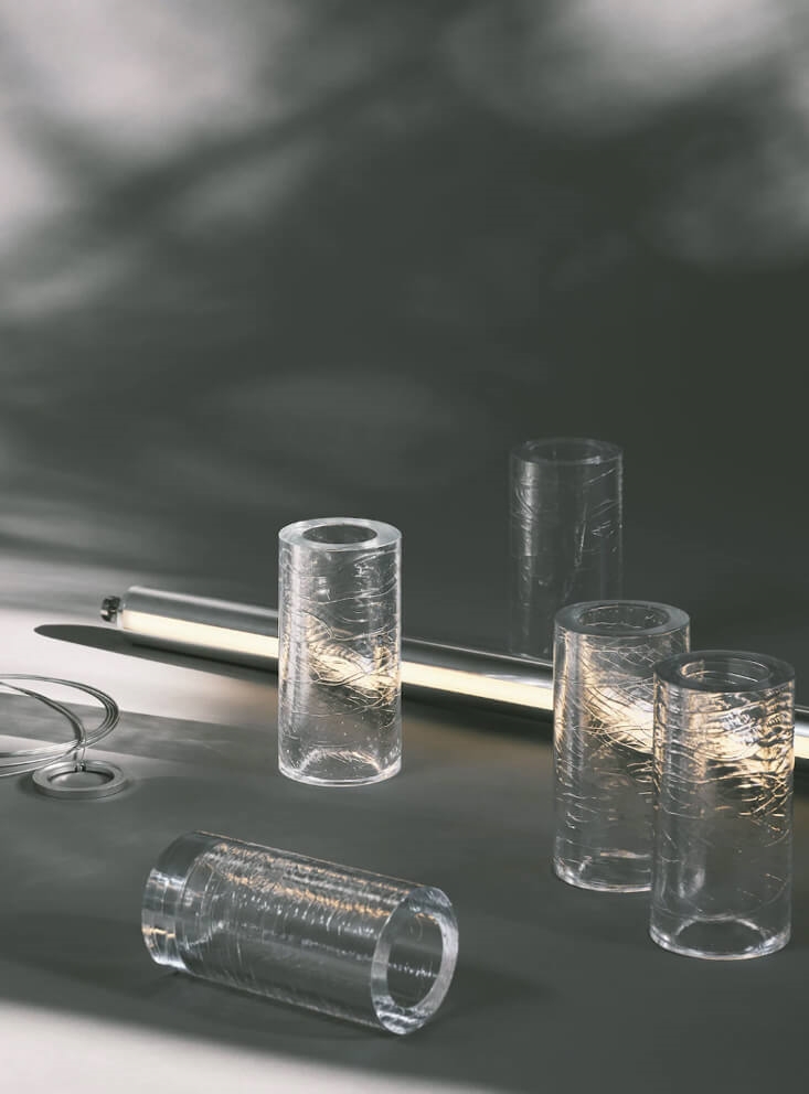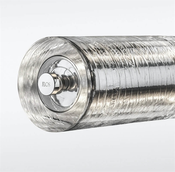 De cylindriske transparente glasmoduler er skabt gennem en håndværksmæssig proces ved at hælde glasset i en roterende form for at opnå en eksklusiv finish, der gør hvert enkelt stykke unikt. Indvendig har glasset struktur i poleret ekstruderet aluminium udstyret med to lineære LED-moduler til direkte og indirekte belysning nedad.