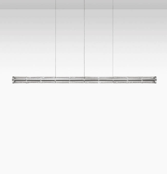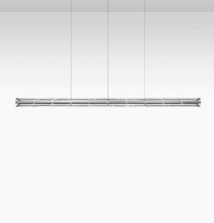 De cylindriske transparente glasmoduler er skabt gennem en håndværksmæssig proces ved at hælde glasset i en roterende form for at opnå en eksklusiv finish, der gør hvert enkelt stykke unikt. Indvendig har glasset struktur i poleret ekstruderet aluminium udstyret med to lineære LED-moduler til direkte og indirekte belysning nedad.