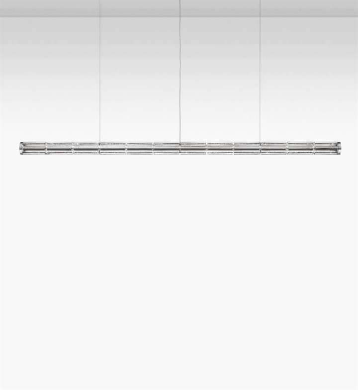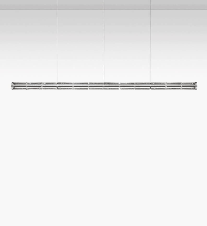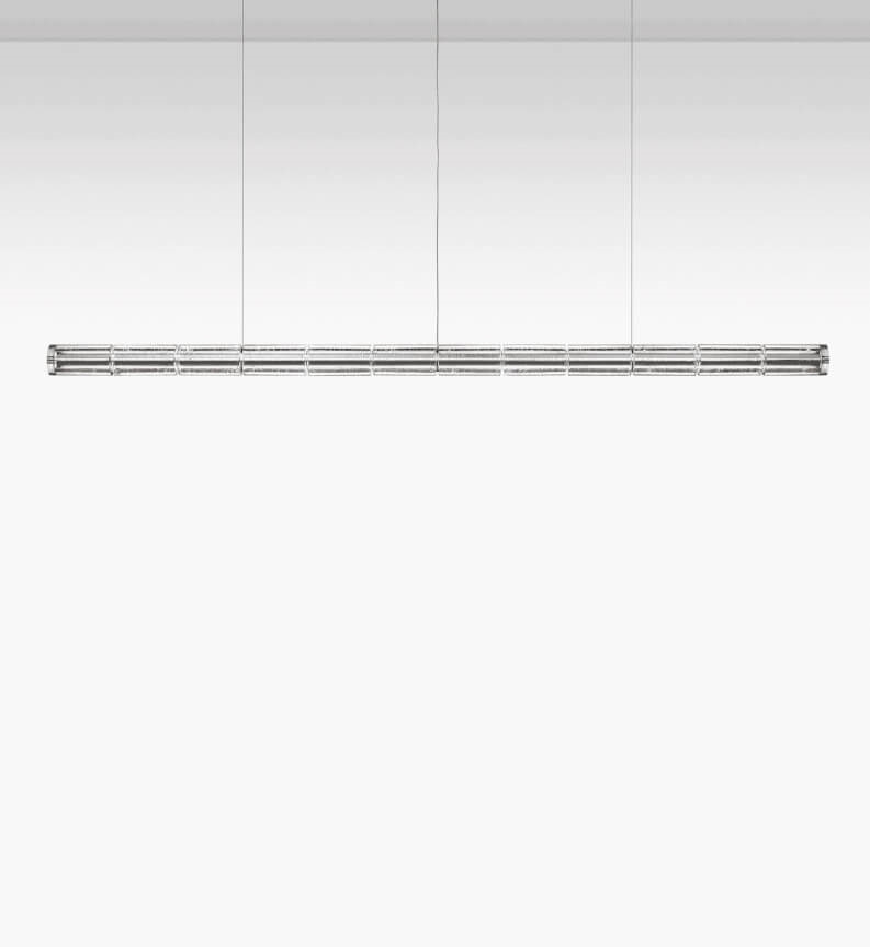 De cylindriske transparente glasmoduler er skabt gennem en håndværksmæssig proces ved at hælde glasset i en roterende form for at opnå en eksklusiv finish, der gør hvert enkelt stykke unikt. Indvendig har glasset struktur i poleret ekstruderet aluminium udstyret med to lineære LED-moduler til direkte og indirekte belysning nedad.