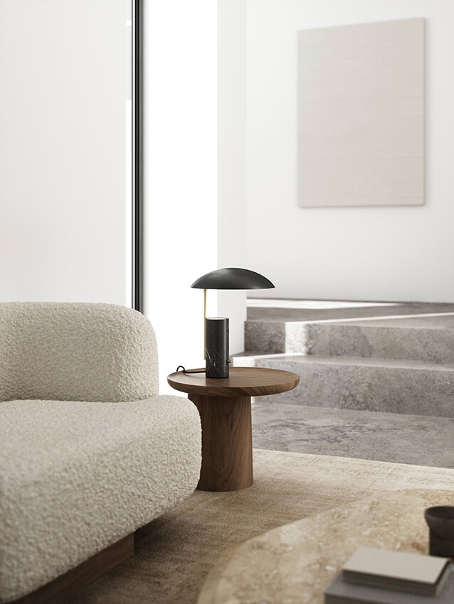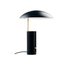Bordlampen består af en marmorbase, med den opløftede skærm. Lyset reflekteres opad i bunden af skærmen, der dermed skaber en blød og indirekte atmosfære.