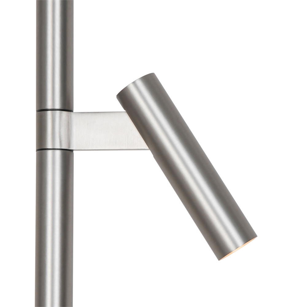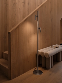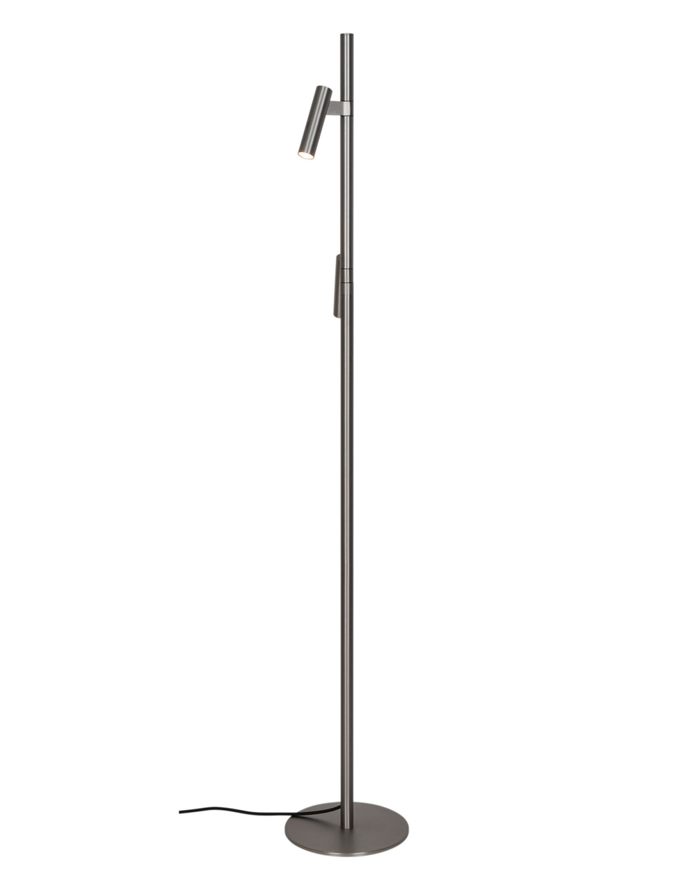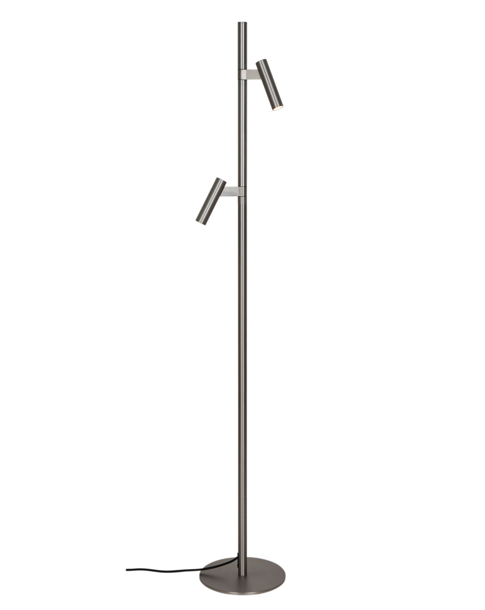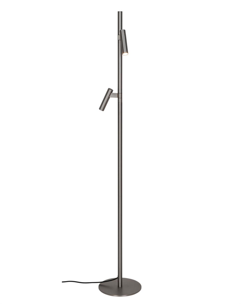 Gulvlampen Makoto er dansk design med et slankt og minimalistisk udtryk og to justerbare skærme. Den varme børstede finish tilfører et blødt strejf til lampens industrielle look. Skærmene kan vippes 30° og drejes 120° og gør den elegante lampe velegnet som læselys ved lænestolen eller sofaen.