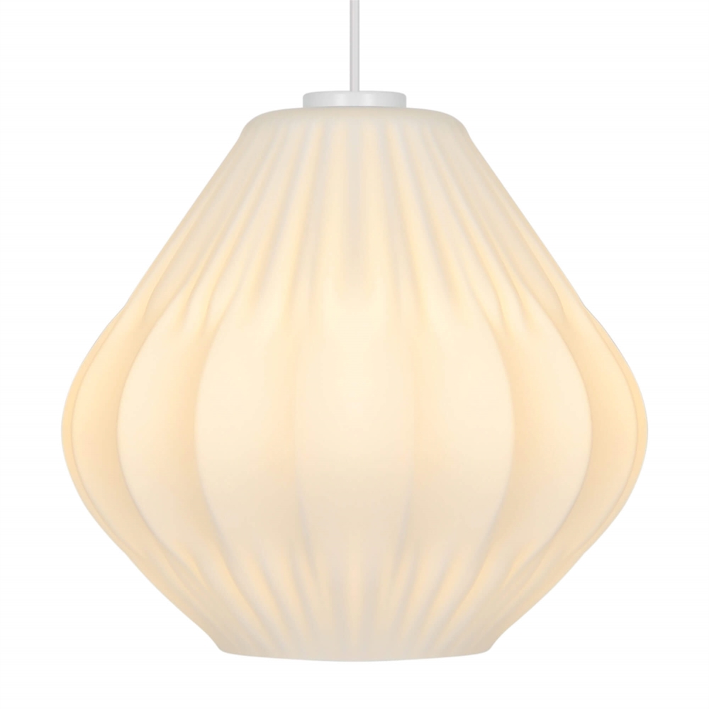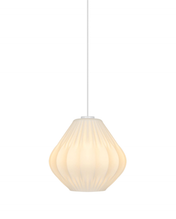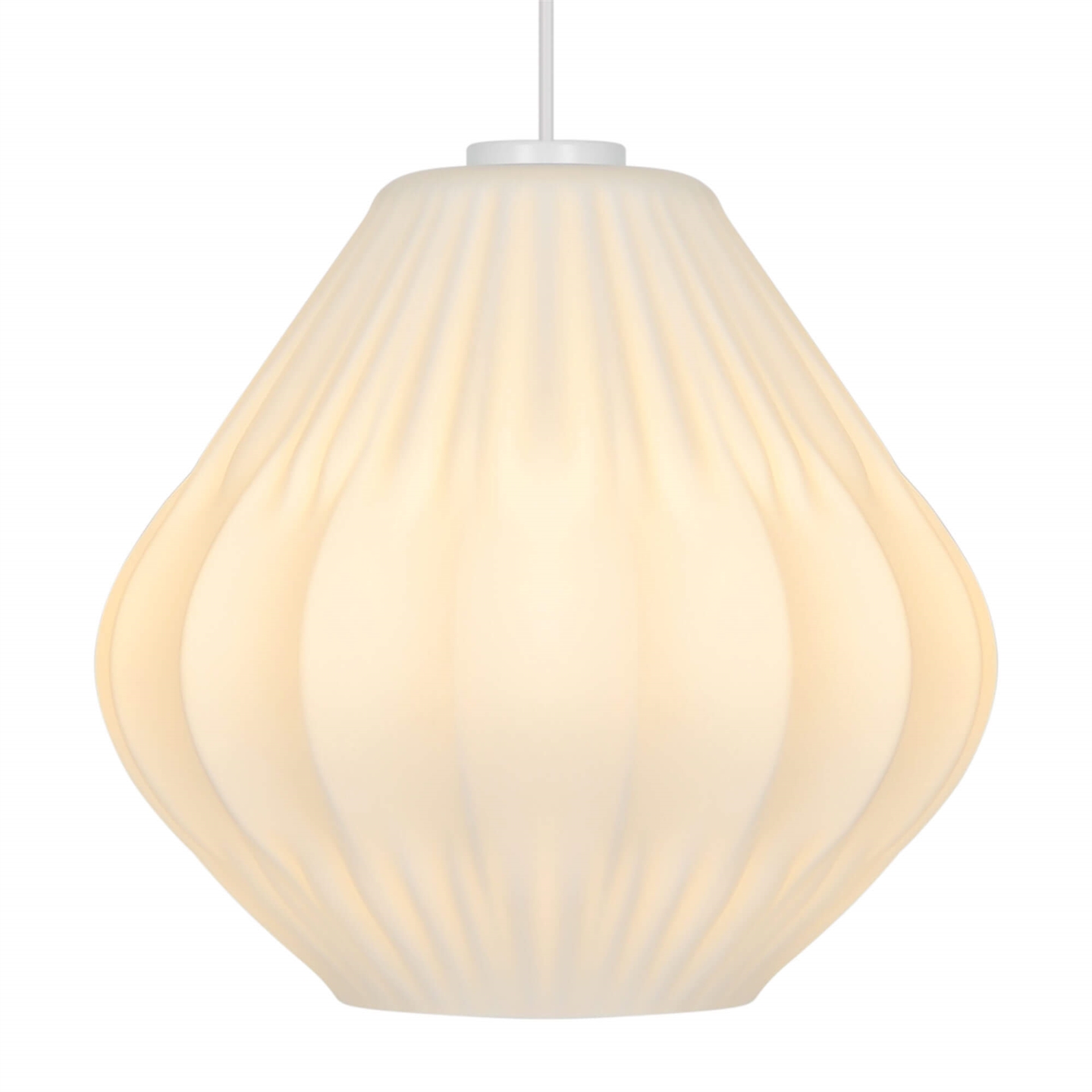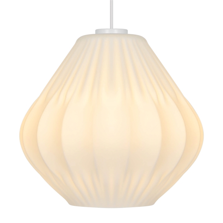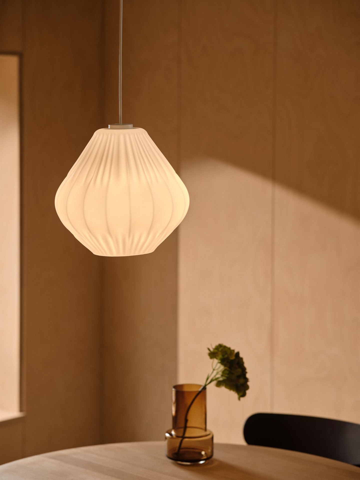 Malucas stilfulde udtryk trækker på klassisk lampedesign med plisserede skærme og er fremstillet i mat hvidt opalglas.