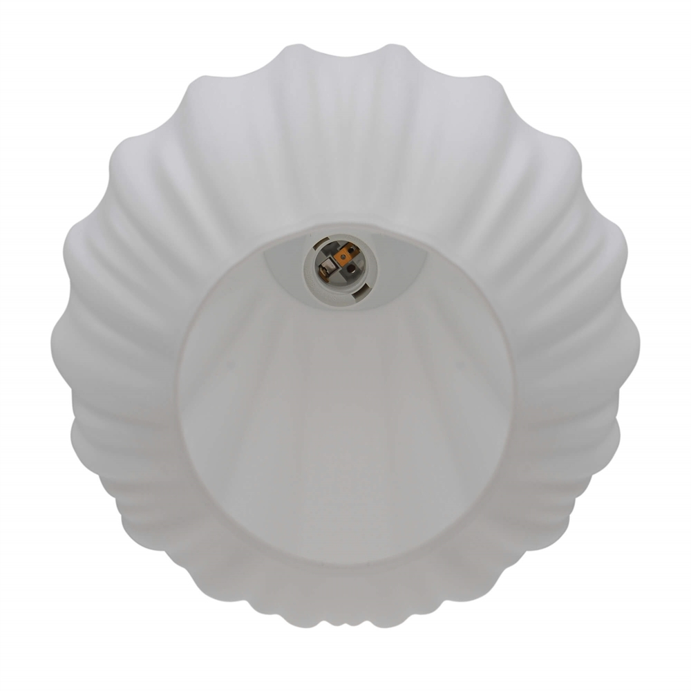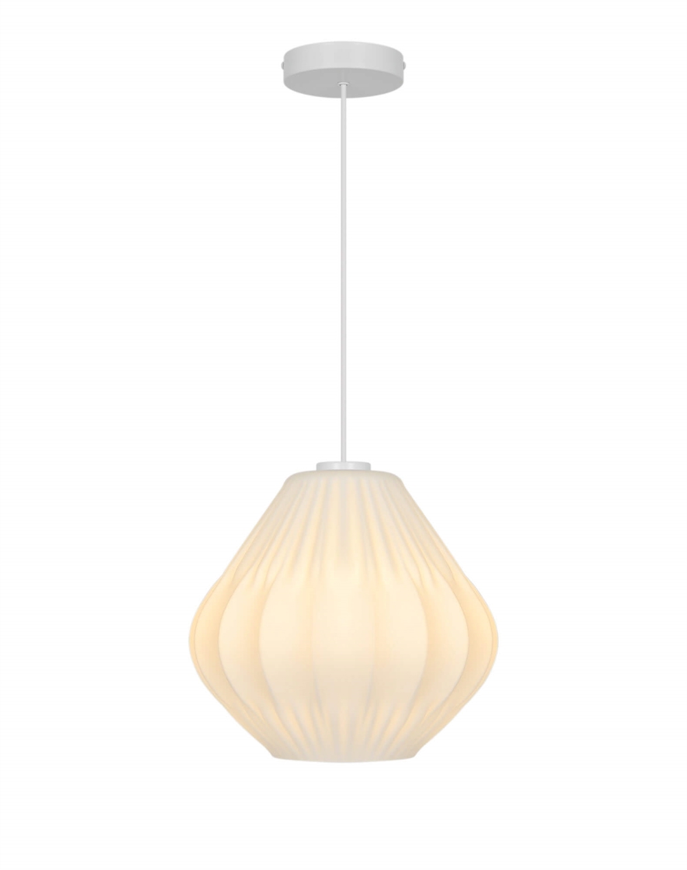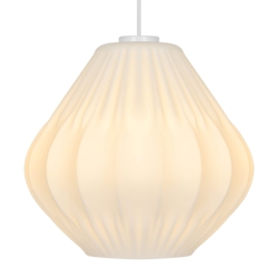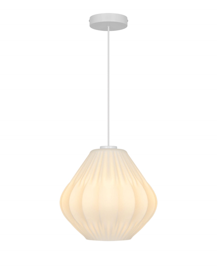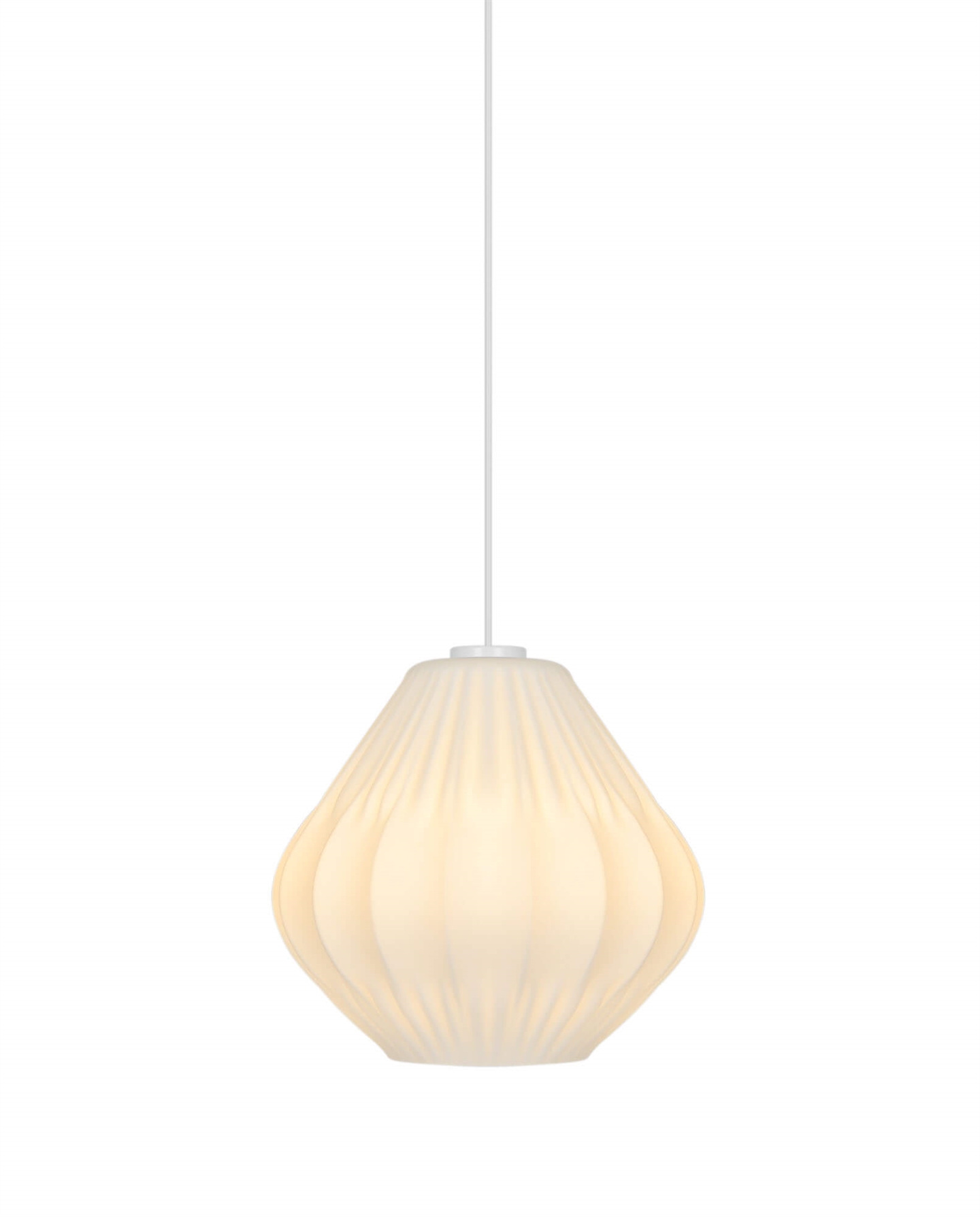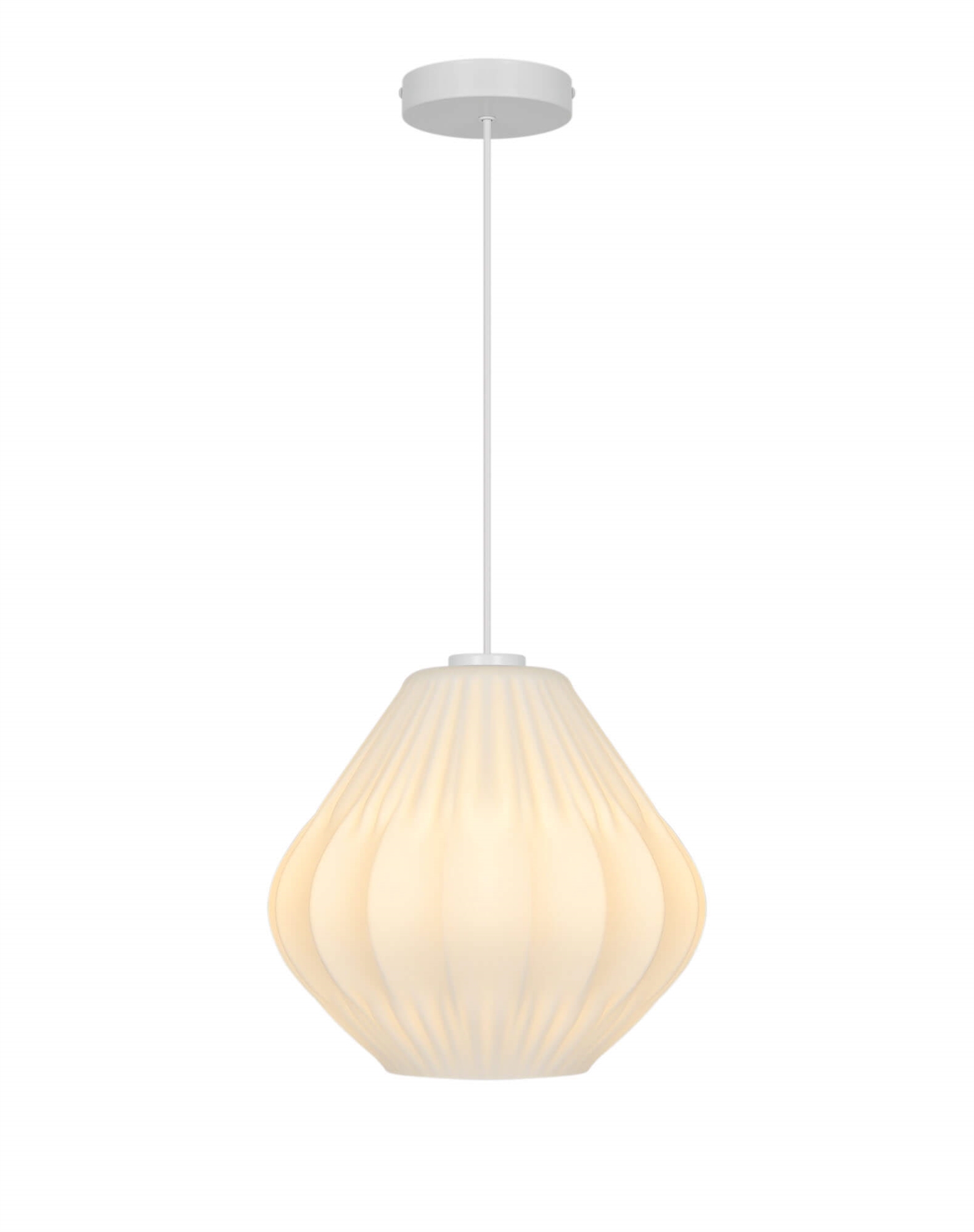 Malucas stilfulde udtryk trækker på klassisk lampedesign med plisserede skærme og er fremstillet i mat hvidt opalglas.