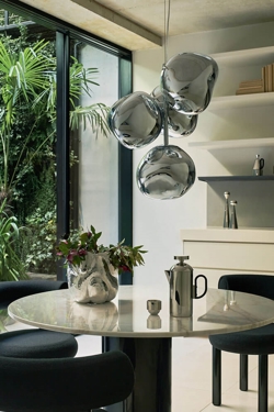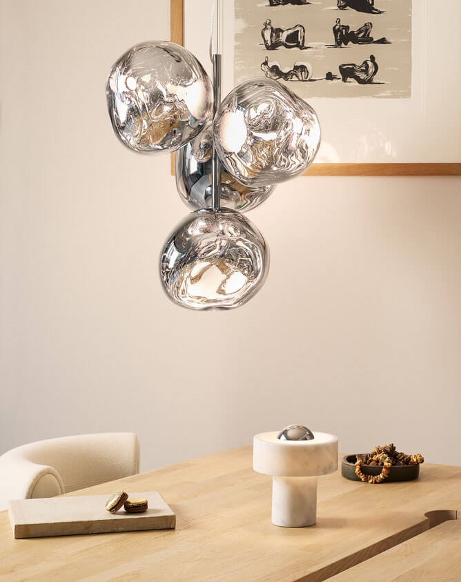 Melt mini lysekronen giver mulighed for at også mindre rum kan få glæde af en lysekrone. Den kompakte miniversion af lysekronerne fra Tom Dixon har fire metalliserede uperfekte kugleskærme med spejleffekt, der er monteret, så de danner en lille klynge. Lysekronen vil passe godt ind i mange moderne indretninger.