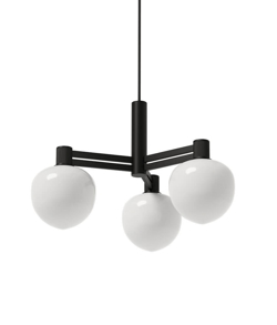 Lysekronen består af et 3-lags opalt glas, der flot kombineres med sorte detaljer. Det tykke opale glas afskærmer lyskilden, så det fremstår blændfrit og ensartet i rummet. Lysekronen ville være perfekt over køkken- eller sofabordet.