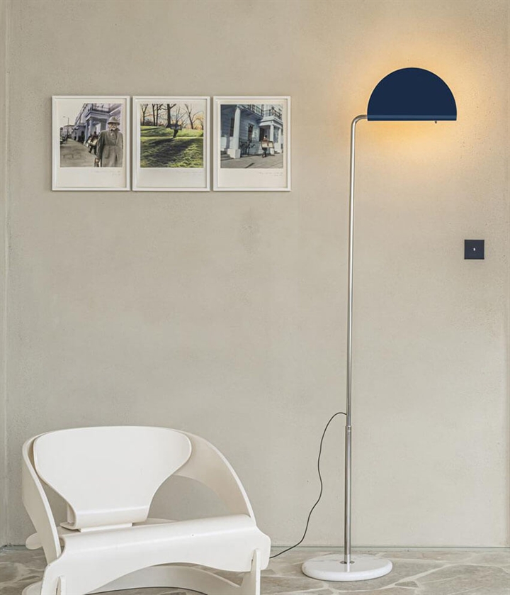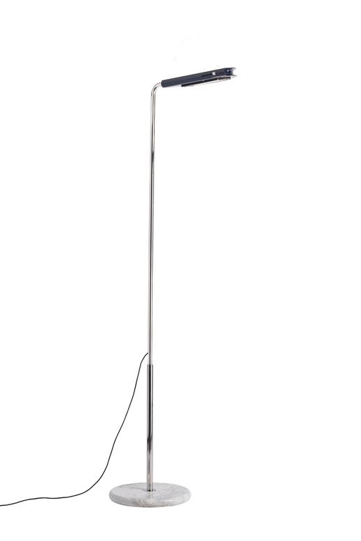 Den smukke gulvlampe har base i hvid marmor og stander med finish i krom og kan justeres i højden via et teleskopsystem. Skærmen i farvet aluminium kan vippes, så lysets retning kan ændres.